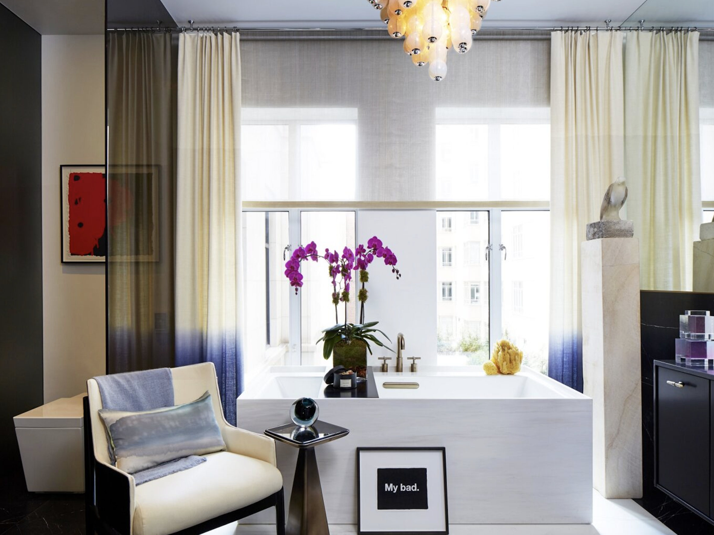 A high-style, Hollywood-inspired master bath for the Kips Bay Decorator Show House, transformed from an awkward raw space into a dramatic, modernist sanctuary of mirrors, marble, and light.