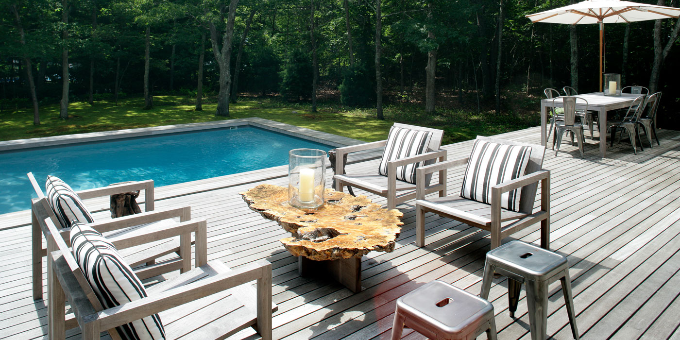 The renovation gave the exterior a modest yet meaningful update, introducing a pool and an expansive mahogany deck to extend the living space outdoors. The house’s original vertical cedar siding was stained a soft grey, blending seamlessly with its environment, while the landscaping was subtly shaped to complement both the home and the native vegetation. Inside, the layout was reimagined to maximize natural light and scenic views, with open living and dining areas ideal for gatherings. The interiors strike a balance of warmth and modernity, mixing rich woods and turn-of-the-century antiques with industrial details like stainless steel accents and bold pops of color. Carefully curated vintage and custom furnishings — from antique hospital beds to Christian Dell lamps — complete the design, resulting in a comfortable, approachable retreat that perfectly bridges modern and country living.