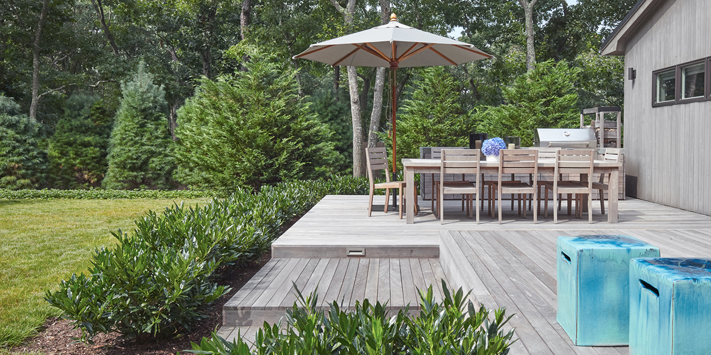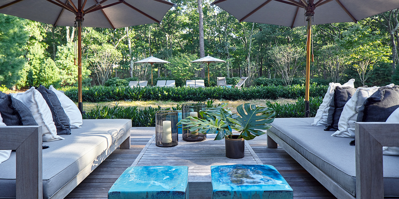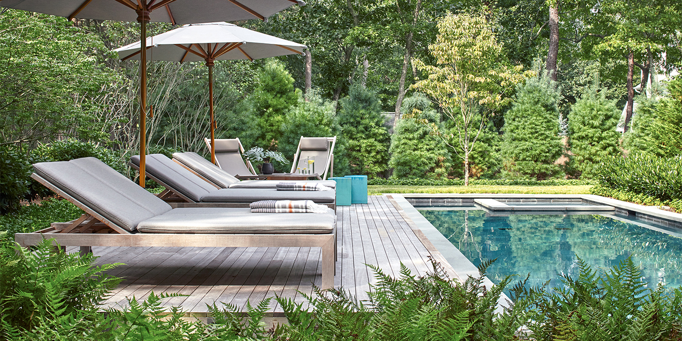 The renovation began with a full exterior refresh, including a new roof, siding, windows, and doors, restoring the home’s clean modernist character. The driveway was relocated to improve privacy and flow, culminating in a series of tiered wooden landings that link the dwelling to its surroundings. In the rear, stepped platforms define zones for lounging, dining, and sunbathing, complemented by aged teak furniture, subtle neutral tones, and turquoise accents. A carefully sited gunite pool with built-in spa, bordered by evergreen hedges, frames uninterrupted views of the adjacent nature preserve.