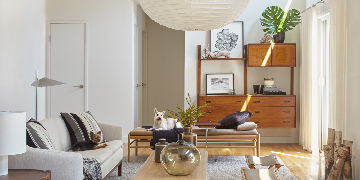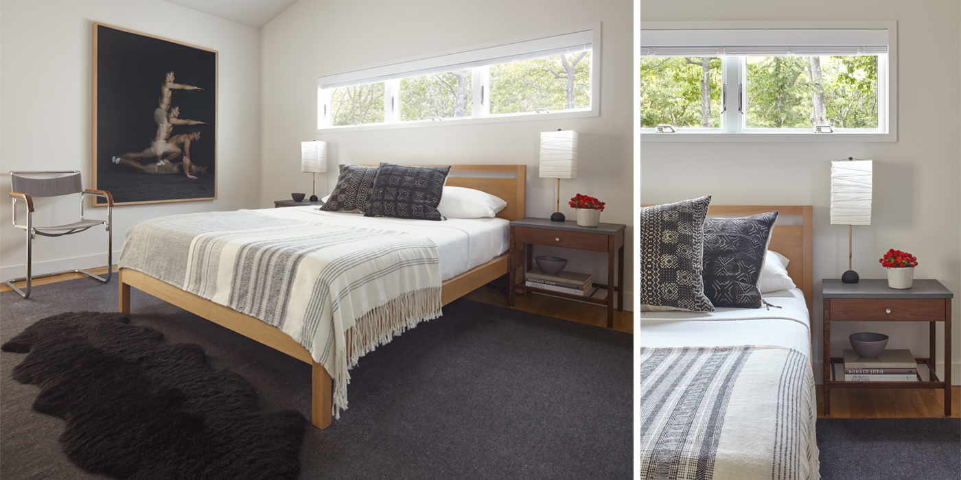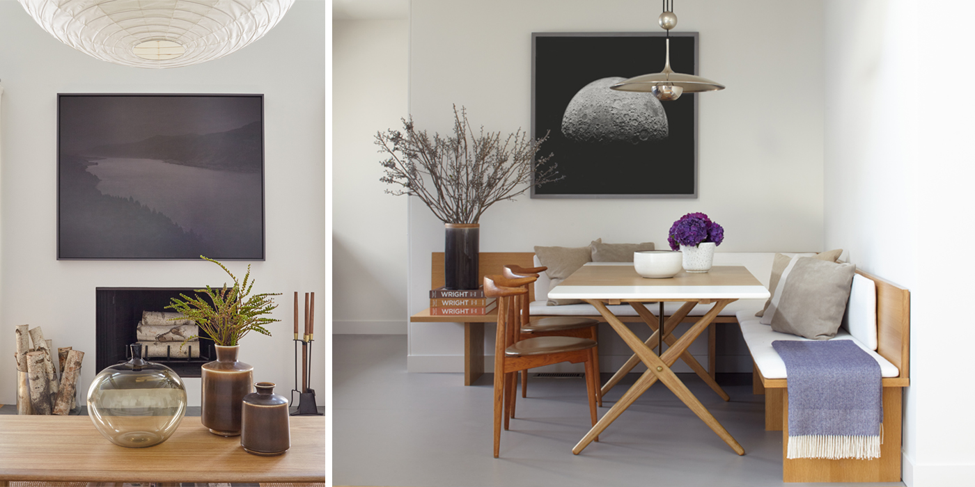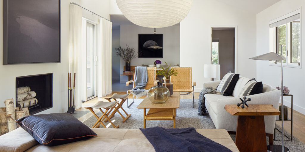 Inside, soaring pitched ceilings create drama and space for an oversized Noguchi fixture above a carefully curated collection of furnishings by design icons such as Hans Wegner, Marcel Breuer, and Finn Juhl, blended with custom contemporary pieces. Warm woods, natural fibers, and luxurious textiles balance rustic simplicity with understated elegance, while subtle chrome accents add a touch of sparkle.