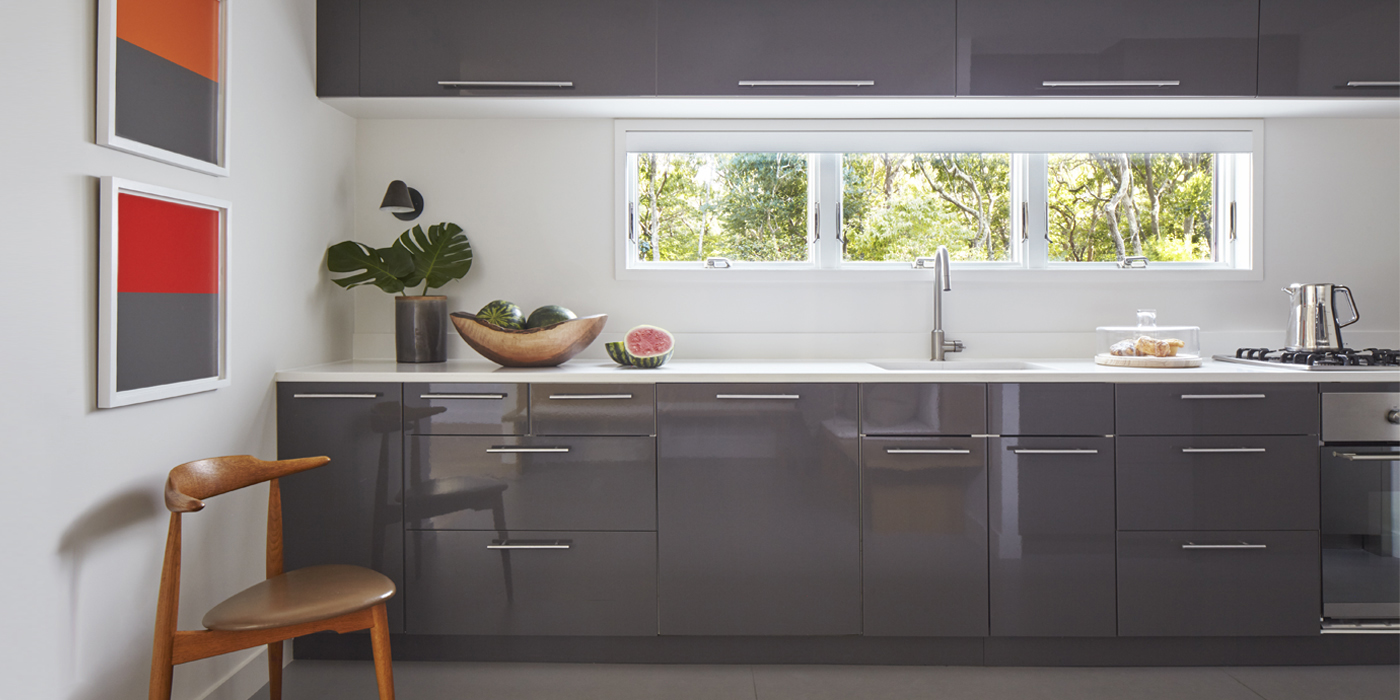 The kitchen was reconfigured for modern convenience, featuring grey lacquer cabinets, crisp white stone counters, and stainless steel appliances. Bedrooms were designed “hotel-style,” each with custom white oak beds and cantilevered wall units, while bathrooms feature cork floors, grey Baltic stone, and metallic details for a serene spa-like experience. Throughout the home, evocative artwork by celebrated photographers and artists echoes the natural landscape, completing this modern, timeless sanctuary.