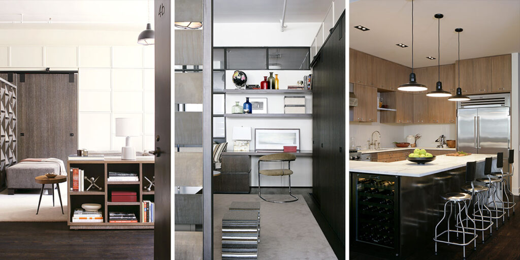 The redesign introduced a series of innovative architectural features to meet these needs. A sculptural partition made of salvaged metal plates creates a striking visual element while subtly dividing the formal living area from the children’s playroom and study. Along one wall, custom millwork conceals a two-foot-deep storage zone, with large ceruse oak barn doors that glide open to reveal space for toys, books, and art supplies — keeping the area lively by day and serene by night.