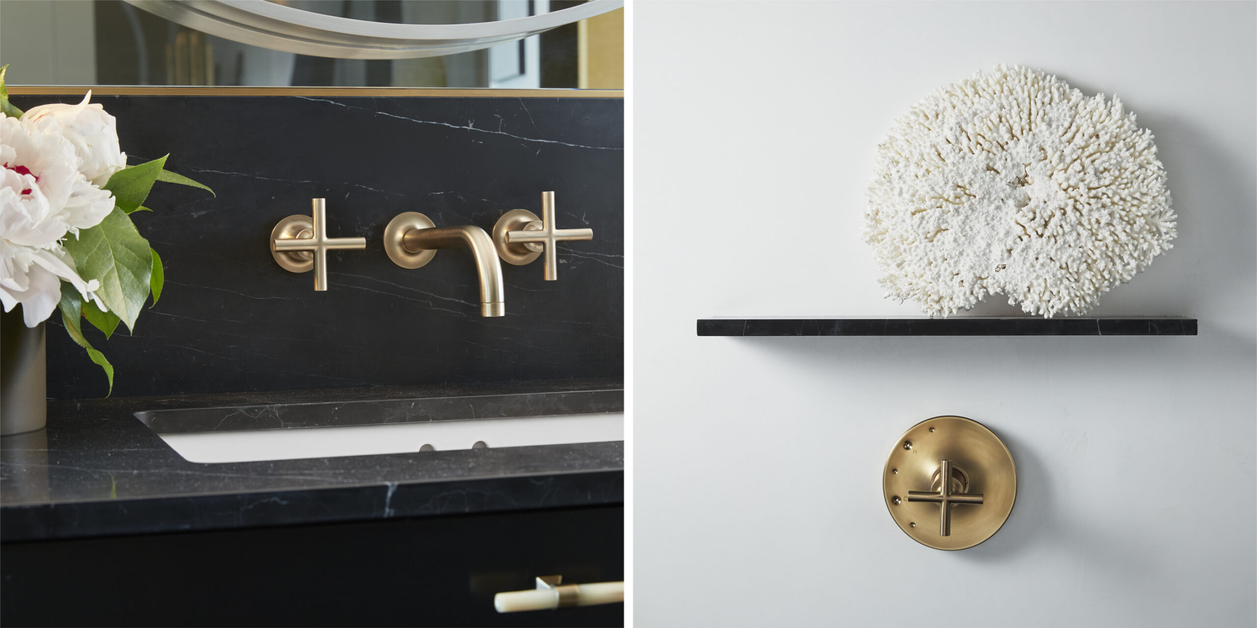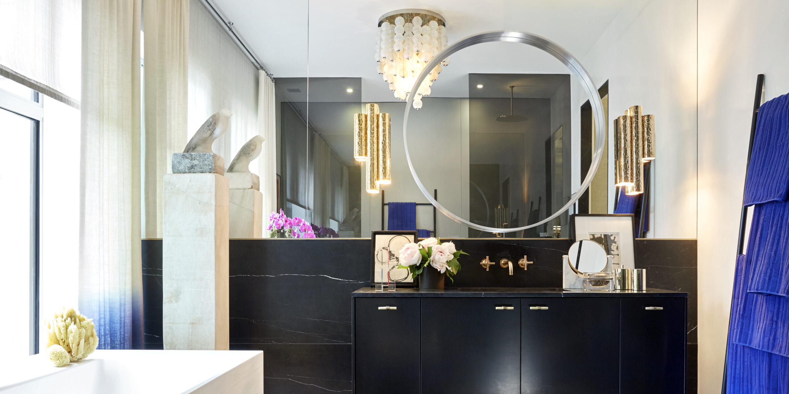 Luxurious materials — burnished bronze, gleaming brass, bold drapery, and curated art including dramatic sculptural pieces — soften the formality and introduce an element of personal indulgence. The result is a refined, harmonious, and breathtakingly cinematic bathroom, balancing modern simplicity with Hollywood glamour.