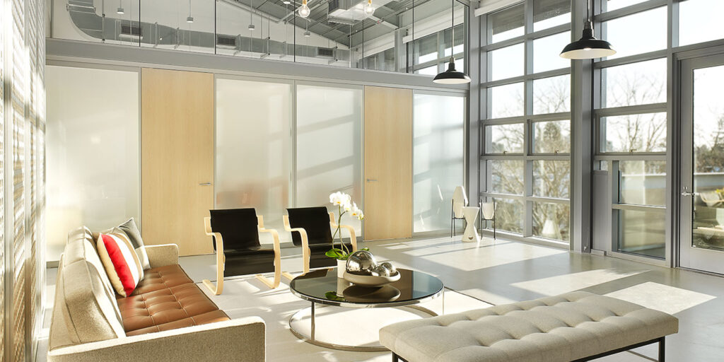 The solution is a carefully orchestrated private-below / public-above layout that leverages the building’s structure and natural light. The lower level hosts executive offices and staff work areas defined by full-height glazed partitions in anodized aluminum, providing visibility and brightness while meeting acoustic needs. Clerestory-level clear glass draws daylight deep into the floor plate, while translucent glazing below delivers privacy where required.