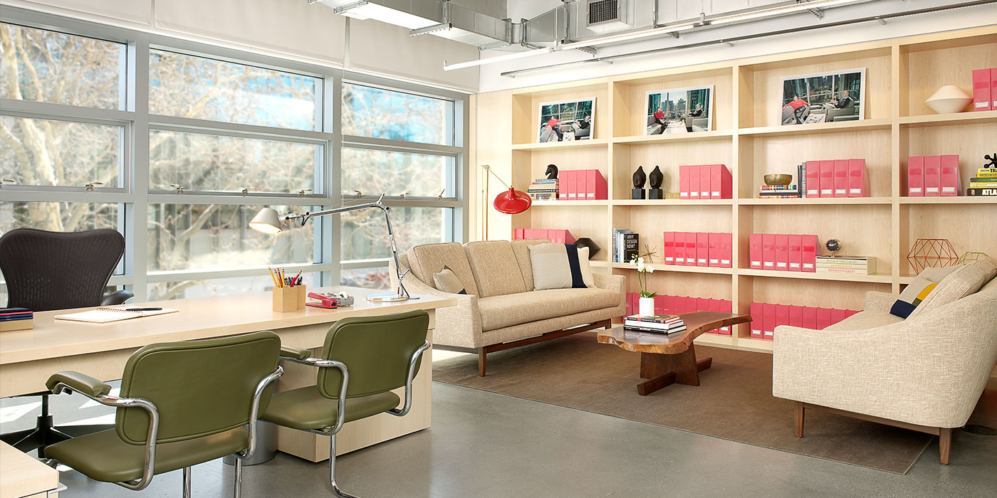 A custom millwork spine organizes circulation and anchors the main workspace, echoed by a grid of open stations in matching light wood. Subtle pops of color and a blend of vintage, contemporary, and tailored furnishings enliven the minimal palette.