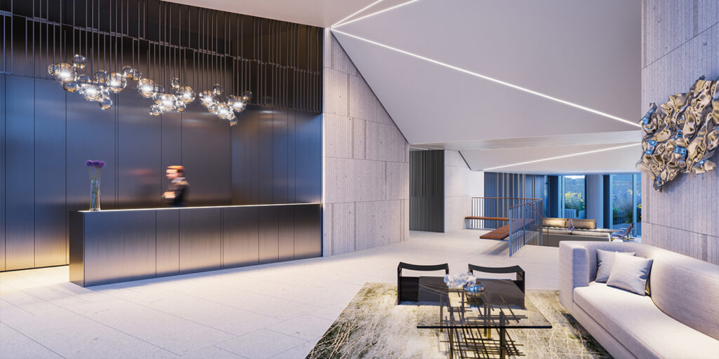 Residents enter through a soaring double-height lobby shaped by a faceted ceiling with angled light slots that echo the tower’s crystalline geometry. Dramatic silver-bronze metal panels line the space, while a shimmering chandelier of subtly hued glass orbs glows behind a vertical metal screen—a nod to the intricate patterns of surrounding limestone. The procession leads toward a serene private garden, seamlessly balancing grandeur and calm.