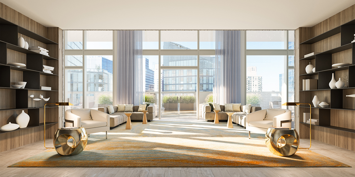 Groves & Co. led the interior design of Three Waterline Square, a shimmering 36-story tower by Rafael Viñoly. Encompassing 214 residences with panoramic river, park, and skyline views, the interiors—from lobby to amenities to private homes—express a cultivated, artistic, and naturally luxurious design language.