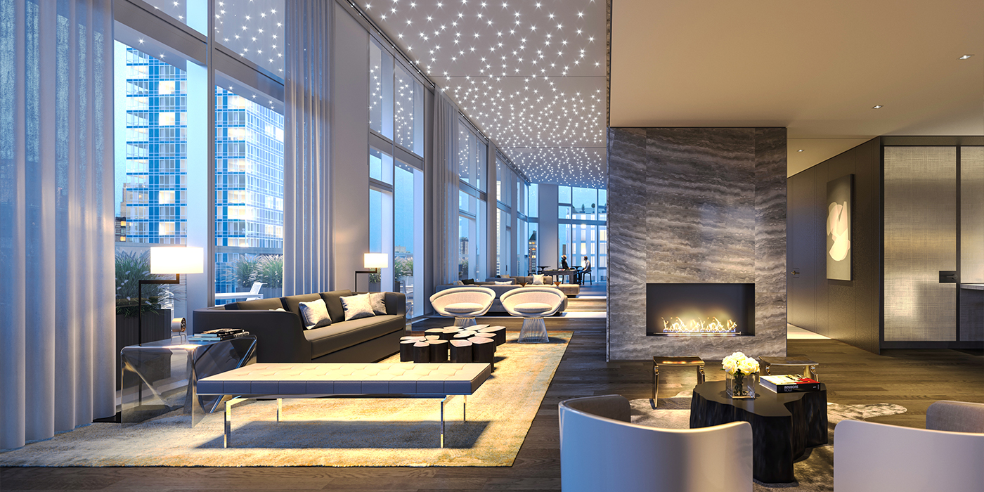 Glamour defines the amenity suite, where onyx fireplaces, bespoke bookcases, and a dramatic double-height limestone-and-glass room create a sophisticated environment for gathering and relaxation. A spectacular dining room—detailed with blackened steel and polished nickel inlay—supports large-scale entertaining, while a media and game room anchors the casual side of the building. Above it all, a custom celestial light installation unifies the spaces beneath a star-studded glow. Expansive outdoor terraces extend the lifestyle beyond the interiors.
