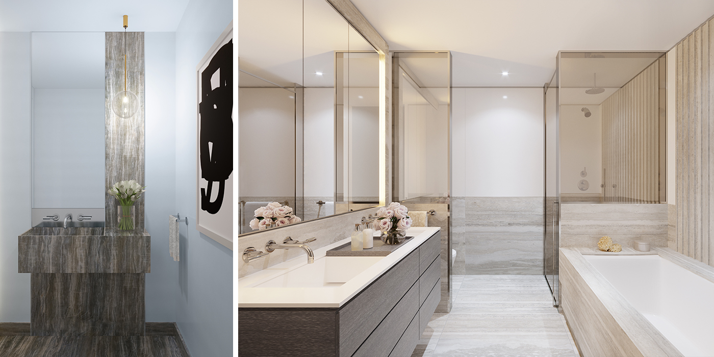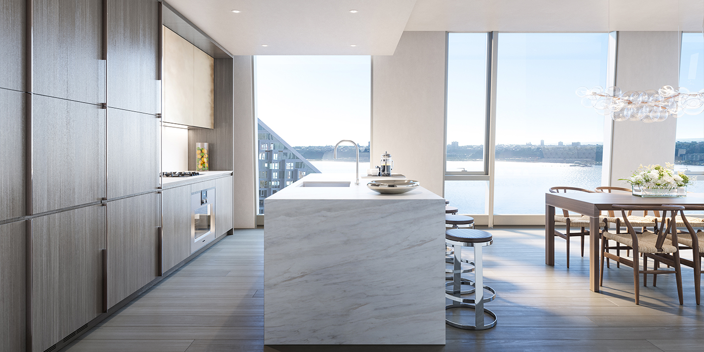 The residences feature soaring ceilings, gently sloped glass walls, and extraordinary views of the Hudson River and Waterline Square Park. Rich woods, sumptuous marbles, and custom cabinetry soften the clean architectural lines. Kitchens are outfitted with refined stone, jewel-like hardware, and top-tier appliances, while master bathrooms reinterpret tradition with classic stonework, polished metals, and bespoke vanities. Powder rooms feature striking custom onyx surrounds for a dramatic, boutique-hotel-like finish.